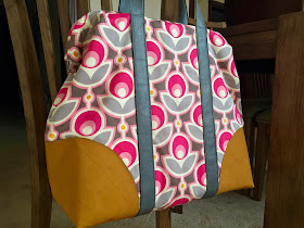 تعليمات الباترون كلها للقماش. و لكن وُضعت إضافات و شرح للراغبين بإستخدام الجلود أو الخامات غير المنسوجة. إستخدمت جلود طبيعية. الأصفر متوسط السمك و قاسي بعض الشيء لذا جعلته للزوايا. الرمادي أقل سماكة و قابل للثني و كانت قطعته أكبر حجماََ لذا كان نصيبه الحزام ( السير ). كان علي تغيير نوع الإبرة و نوع الخيط و طول الغرز كلما بدلت بين القماش و الجلد. كان هذا هو الشيء الوحيد المزعج و لكن النتيجة النهائية كانت تستاهل هذا الإزعاج.